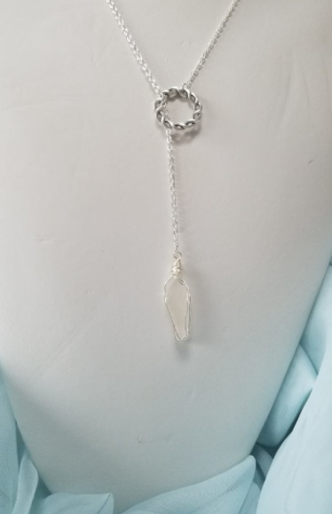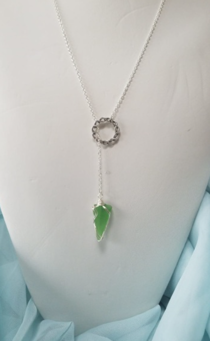 A drop of beautiful sea glass wrapped in .925 sterling silver wire. This design hangs from a 20" sterling silver chain. Available in two designs: